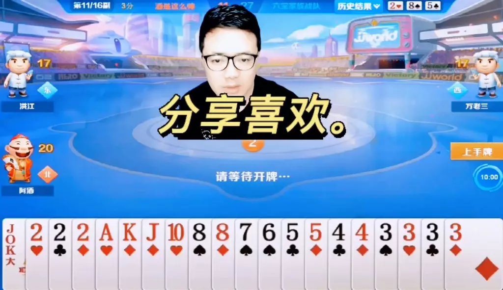三岁玩牌破釜沉舟四个3的大胆一炸后期残局细腻的行牌为自己争取到了胜利!