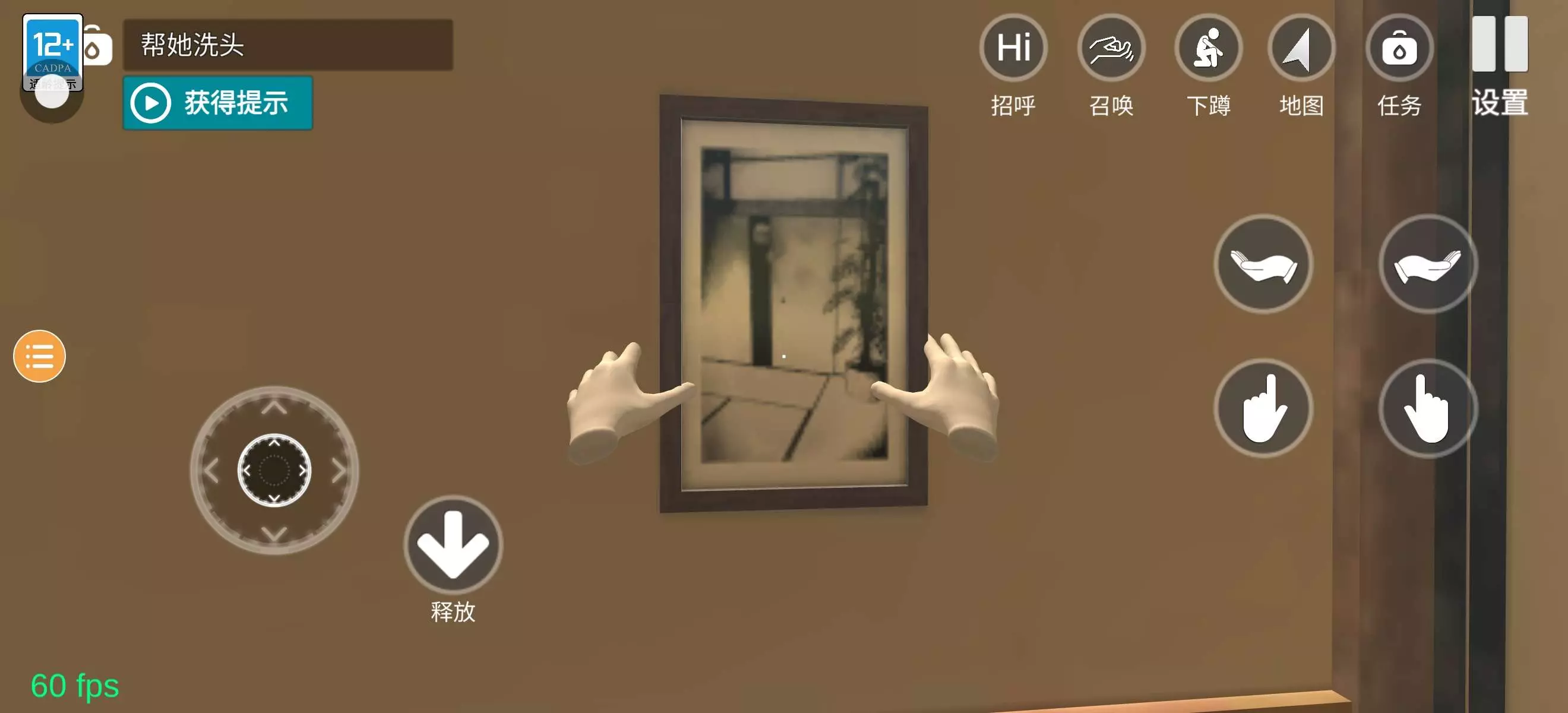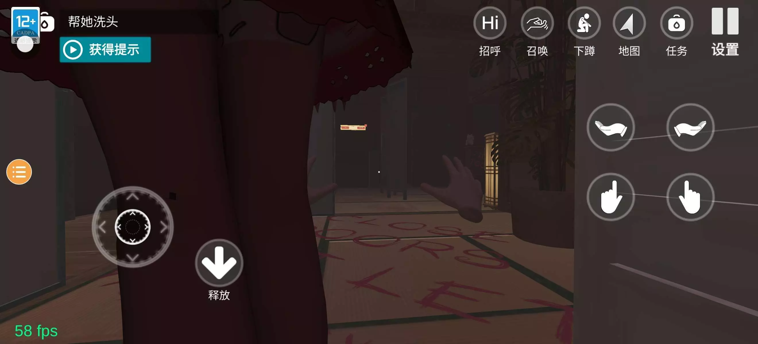 就是拿毛巾的地方,右边,有一幅画掉在地上,墙上会有掉色的边缘,不会扶画的话,就是先蹲下,左右手放在画上,画就会粘在手上,起来的时候,手势第二行第一个,边按着边点起立,把画扶起来之后,就是第三第四幅图的样子了,外面天很黑,什么东西都看不到,地上还有用血写的英文字,前台的猫还会自己动,墙上还有血,到处都是,小忍一直抱着头,真的很恐怖,过了一分钟会有类似于石头碰瓷的声音,二分钟左右会有类似于水滴的声音过了几秒水滴声就没了,不过会有类似于密室逃脱里的鬼叫声,就像很多个鬼在叫😫😫😫,我到处走,时不时还会有白色衣服的女人飘过来,红色衣服走过,前台的地上也有很多血,可以放大看第三张图片,过了几分钟天会自己亮,真的很恐怖😭😭😭