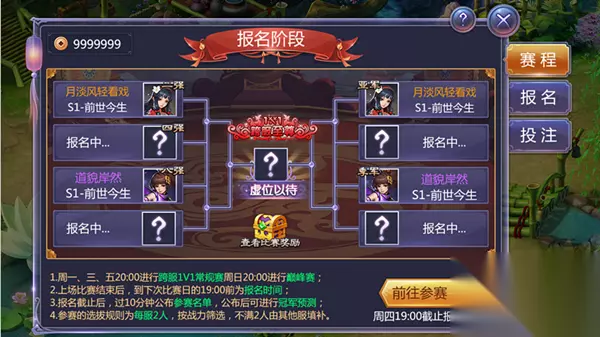 合理分配,公平切磋 同时,作为跨服PK玩法,《寻找前世之旅》手游跨服至尊1v1玩法为玩家设置了更为合理的匹配规则,不仅考虑到服务器战力名列前茅的玩家可以在赛场上尽情展示自我,且充分照顾了游戏内普通玩家的需求。活动报名结束后,根据报名数据,总战力最相近的四个服归为一个赛区,四服中选战力最高的二人参赛,当然战力不满足条件的玩家也可参与赛事,为自己支持的选手投注,不仅如此,在观看比赛的同时玩家可以获得大量的经验,投注的对象获得冠军后更可根据投注金额获得高额奖金!一举两得!