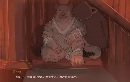 说明4、 恐惧药水 任务流程: 与第一次冲突不同,这次只能任选一边接受任务,走和平线时,无论在哪边接受任务,只要接受后和Thane讨论,然后通过找Chet制作恐怖药剂吓退两方的人,就不会影响后续的和平路线。 接受牛头酋长Axel的任务,再和Thane讨论——智慧&敏捷鉴定。 接受蜥蜴Selye的任务,再和Thane讨论——力量&魅力鉴定。 PS:属性值≤6,则为不合格,会损失一定的金币,但依旧能完成任务。 交付: 制作好恐惧药水后,先找thane,然后开始执行营地任务。 结束后,可触发与Nauxus和Axel的新对话,对话结束后的第二天,两边的酋长都会对主角Eyvind进行意☆味☆不☆明的特训。 训练结束后,标志着第二次冲突的结束,支线:异世界红龙Roushk触发,双方迎来了短暂的和平。 彩蛋:Nauxus的特别训练“看图说话”,如果全部猜中,会解锁一段Eyvind在Nauxus身上绘画的小甜剧情,详见灵魂画作解读。值得注意的是“看图说话”的内容是有多种情况,可以多读档几次看看。 【Part、3】抉择——命运试炼 触发前提: ①完成【Part、2】 ②完成支线:异世界红龙,Roushk回家后,去找Nauxus会发现他也穿越了,之后再回到酒馆就进入了【Part、3】。 剧情梗概: 开心摸鱼结束后,回到酒馆的Eyvind收到了两个村子留给他的密信,双方的矛盾激化到了极点,各自开始为战争进行筹备。 蜥蜴村:Nauxus想要和流氓蜥蜴谈判以扩充军队。 牛头村:Alex想要炸掉蜥蜴人的祭典舞台。(伤害不高,侮辱性极强)