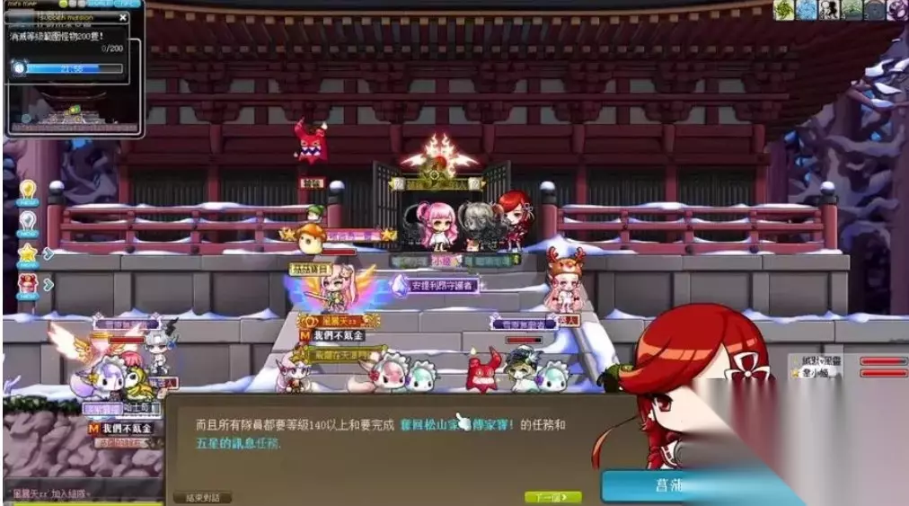 冒险岛浓姬前置任务流程 变身剑都夺传家宝:完成上述任务后,您将获得关键道具,并可以变身成剑都夺传家宝。在这个阶段,您需要合理使用技能和药水,因为战斗将会比较困难。击败浓姬:在剑都夺传家宝的状态下,击败试图复活魔王的浓姬。这是任务的关键部分,确保您在战斗中准备充分。完成五星任务:最后,您需要完成五星任务,其中五星的意志火任务可能是较难的一项,特别是对于没有达到140级的玩家来说。