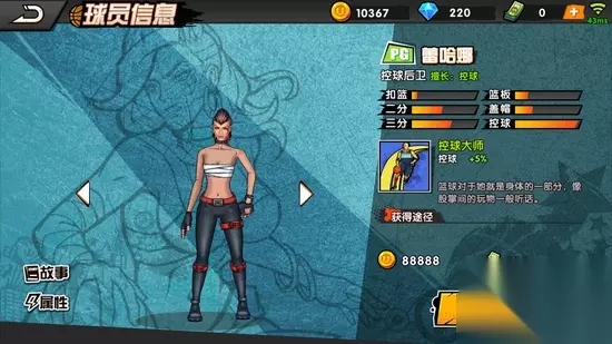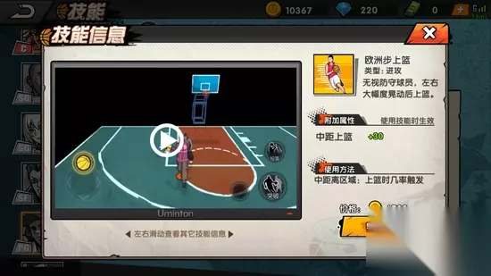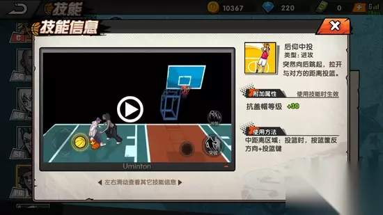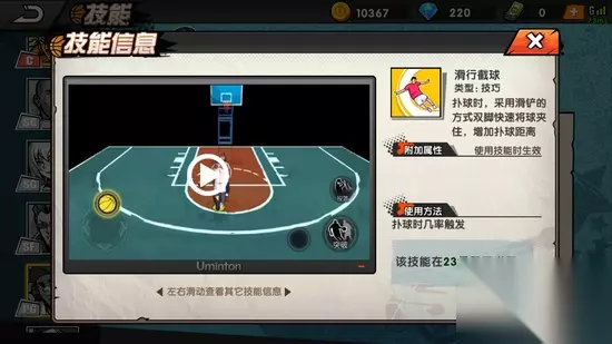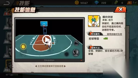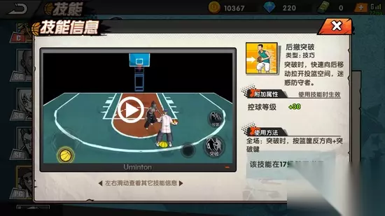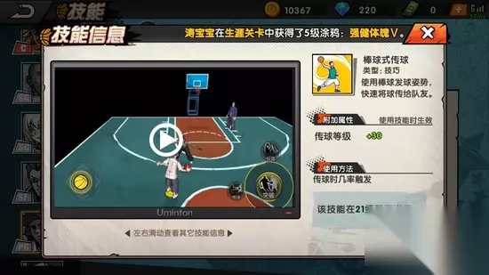 2、突破技能 (1)横向突破 突破时通过横向移动拉开投篮的空间迷惑防守者,控球等级+30,突破时按左右方向+突破键生效。 (2)花式突破 突破时用眼花缭乱的动作迷惑防守者,控球等级+30,突破时按方向键+突破键生效。 (3)后撤突破 突破时快速向后移动拉开防守空间,迷惑防守者,控球等级+30,突破时按篮筐反方向键+突破建生效。 3、传球技能 (1)棒球式传球 使用棒球发球姿势快速将球传给队友,传球等级+30,传球时几率触发。 4、扑球技能 (1)滑行截球 扑球时采用滑铲的方式双脚快速将球夹住,增加扑球距离,扑球时几率触发。