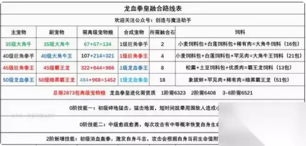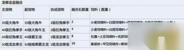 龙血拳王融合: 据官方消息,这个融合战宠是防御能防能打的。 合成公式是: 两个35级的大角牛合成巨角拳手 巨角拳手40级和大角牛王,合成巨角牛王 45级巨角牛王加45级红霸合成龙血拳手。 龙血拳皇融合表 融合龙血拳皇过程宠所需高级宠物粮为2873包
