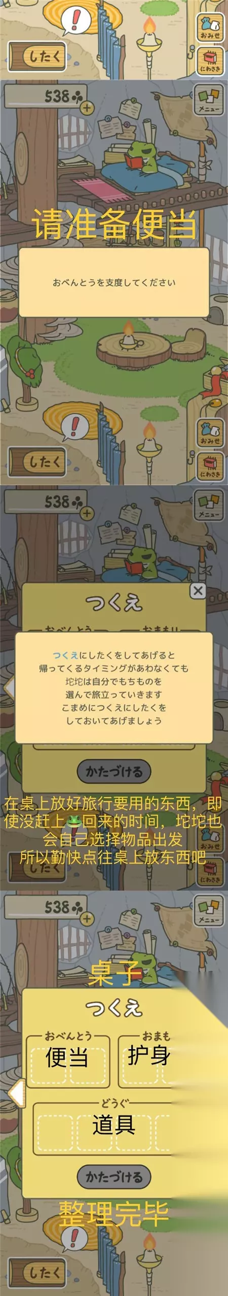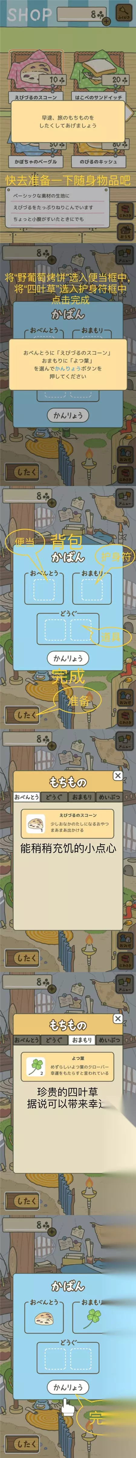 背包由三个部分组成: おべんとう(便当) おまもり(护身符) どうぐ(道具) 按照图片指示整理好背包点击「かんりょう」(完成)就好啦。 【首次启程】