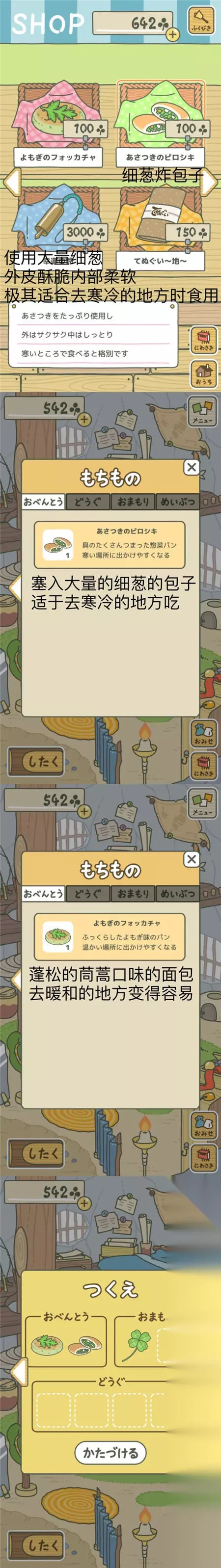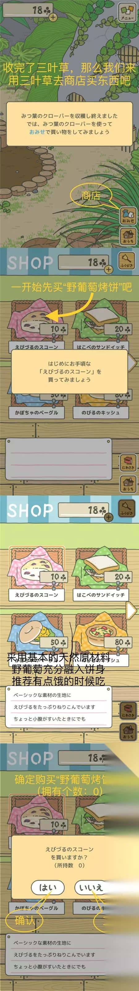 用收割获得的18枚三叶草去商店买便当时,点击“野葡萄烤饼”,此时出现红框圈定,再点击一次就会出现购买确认窗口了。 【整理背包】