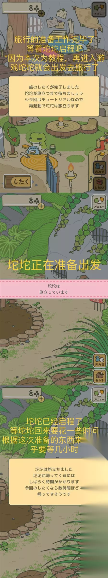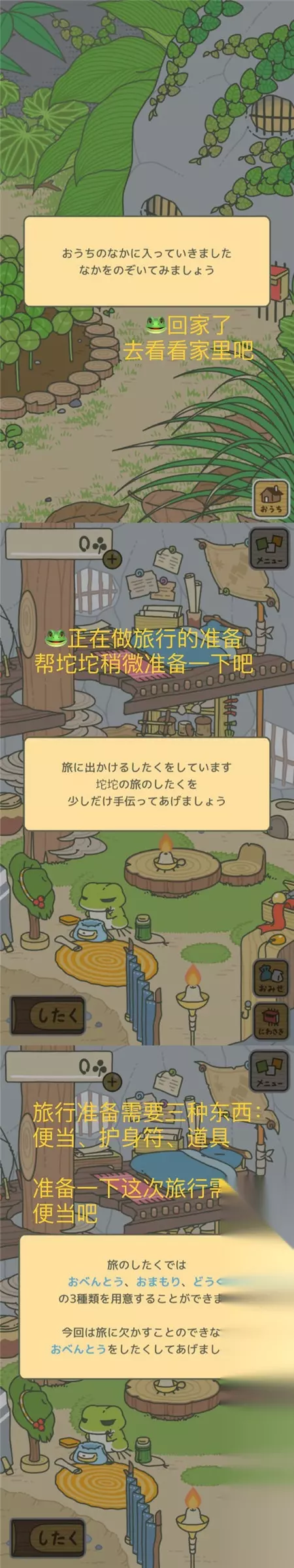 目前大多数玩家下载的是日文版的旅行青蛙,里面的文字基本看不懂,所以很多小伙伴无从下手,看不懂日文怎么养儿子!不要着急,目前233乐园已经有了汉化版本,大家可以安心下载玩耍了! 说在前面的话:旅行青蛙汉化版其实已经推出,下载后游戏内文字均为中文,推荐玩家下载哦。 旅行青蛙汉化版下载地址:点击此处 【游戏准备】