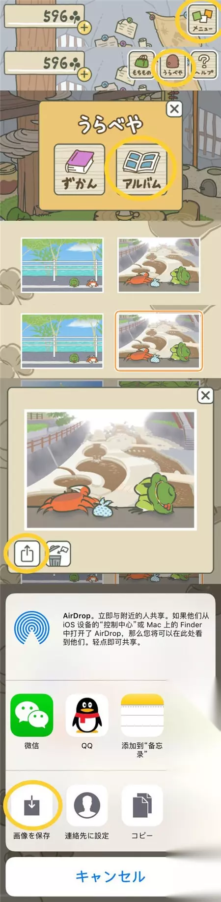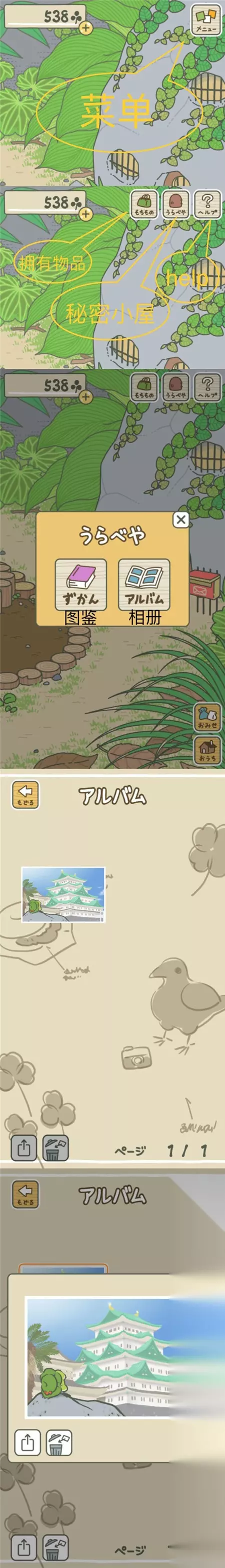 依次点击菜单、秘密小屋、相册就可以查看目前为止所有青蛙旅途中的照片。 坨坨的第一次旅行去了名古屋城(自己根据照片判断的,不敢肯定),此处科普一下:名古屋城是位于日本爱知县名古屋市的城堡,与大阪城,熊本城被合称为“日本三大名城”。 【邮箱的使用方法】