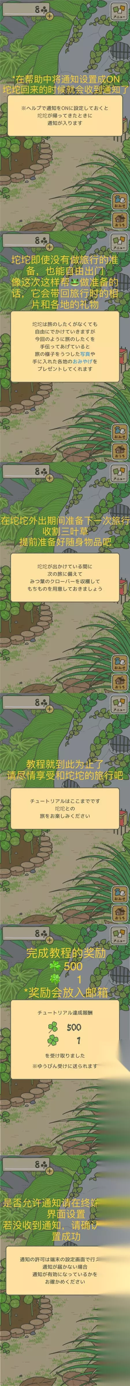 如果成功开启了通知,青蛙回来时就会通知你:坨坨回来啦! 收到提示后进入游戏,坨坨带回来两种礼物:当地特产物品(分为稀有级别和普通级别)、照片 还会收到旅行奖励:三叶草和一张东西 P.S.我也不知道那张是什么东西,所以没有标注,如果有知道的告诉我一下吧…… 【菜单使用方法:查看物品图鉴】