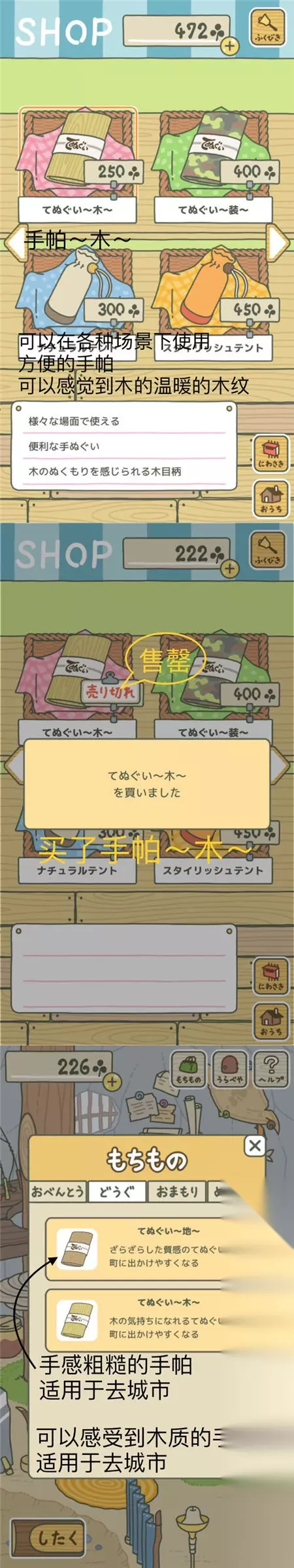 这次买了木质手帕,顺便补充上了上次买的普通手帕的介绍。 P.S.手帕属于道具类,道具都是买过一次就可以重复使用的,所以买过的道具旁边就显示“售罄”。 未完待续....因为需要翻译的内容实在太多,这里暂时先整理出以上这些,相信应该已经能解决部分玩家的需求了,后续还会陆续更新,敬请关注233乐园旅行青蛙专区哈。 PS:目前旅行青蛙已经出了汉化版,游戏内的文字为全中文,推荐看不懂日文的玩家下载哦。 旅行青蛙汉化版下载地址:点击此处