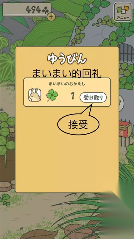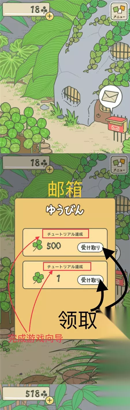 一般完成任务后,庭院里家门口的邮箱都会出现信封图案的气泡,点击即可查看。 如图我领到了500个三叶草,红框部分是获得奖励的原因(第一次是因为完成游戏教程) 【日常任务:准备旅行物品】