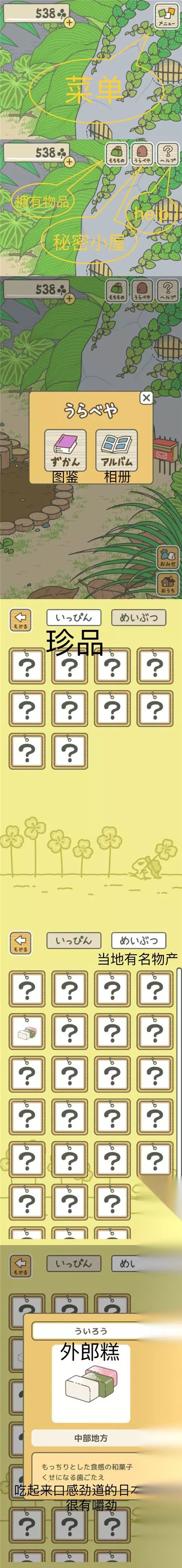 依次点击菜单、秘密小屋、图鉴就可以查看目前为止所有青蛙带回来的东西。 坨坨的第一次旅行带回了外郎糕,此处科普一下:外郎糕是一种在米粉中加入红糖蒸制的糕点,是名古屋、山口县等地的特产。 【菜单使用方法:查看相册】