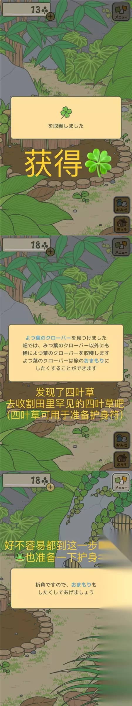 青蛙旅行所需物品包括:便当、护身符、道具(这句话划重点,以后可能都会用到) 说明一下:“坨坨”是我的青蛙的昵称。 【意外收获四叶草】