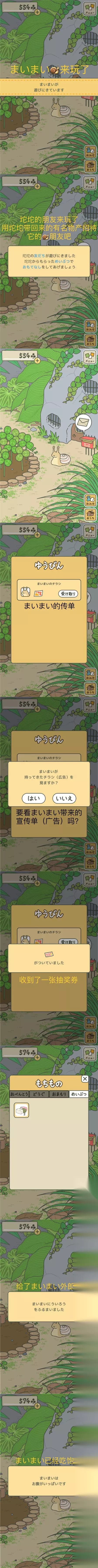 朋友来访会带来宣传单(其实就是广告),可以在邮箱查看,看了就能得到奖励。 可以用收集到的物产(めいぶつ)招待朋友,直接点击まいまい(这只蜗牛的名字),再点击蜗牛会显示它已经吃饱了不要再送它物产了。 【朋友的回礼】