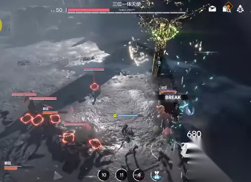 进入第三阶段,天使会采取隐身策略,此时,玩家必须依赖AOE技能才能使其显露身形。这一阶段,天使还会发动追踪弹和多个球形的特殊攻击,玩家需密切留意由AI操控的队友的血量状况,及时施以治疗技能或补给品,确保队友生命值处于安全水平。此后,玩家只需持续不断地迫使天使现身,逐渐削减其防御韧性条,就能稳步减少其生命值,直至最终达成通关目标。