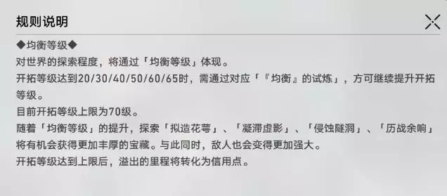开拓等级达到20/30/40/50/60/65时,需通过对应「均衡的试炼」方可继续提升开拓等级。对我们收益的主要影响体现在「凝滞虚影」、「侵蚀隧洞」、「历战余响」、「拟造花萼」、「每日实训」、「模拟宇宙」等。 优点:均衡5→均衡6奖励提升 遗器本、历战余响、模拟宇宙有概率能开三金,且最低掉落的遗器为紫色,意味着更多的狗粮,遗器等级能够更好的提升,在目前资源短缺的环境还是很香的。(该说不说这个三金概率真不大,可能我脸黑) 锄大世界的经验和信用点增多,每日实训经验、信用点等增多,模拟宇宙每周获取的星琼(多30)、信用点(多5w)、经验等增多。 缺点:升到均衡6面临是问题 大世界小怪等级提升,剧情怪等级提升,活动难度、周本、模拟宇宙等难度提升。 例如最近的新活动大家吐槽说升了均衡等级后反而凹不满5w分了; 过新活动剧情的时候给丰饶灵兽一锤锤死俩队友; 平时锄大地一棍一个小朋友现在变成给怪刮痧挠痒... ... 而目前一旦晋升均衡6就不能降低回均衡5。 最大的直观感受就是大世界的怪血量厚了很多(怪变成82级,血量大概提升了60%-70%),队伍整体变刮痧了(不过确实我比较佛,练度一般)打周本的困难程度也有所增加,耗费的时长增加了不少。