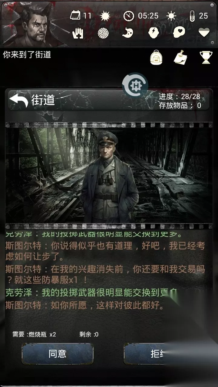 军火交易 当你认为世界上最黑暗的交易是酒吧时,那就错了,在一个名为街道的地方充斥着一种名为军火交易的地方,2燃烧瓶换防爆服/防毒面具/斧头(意味着你没必要造三本了)