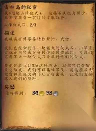 任务步骤: 1、这个任务要求玩家收集三个山泽仪式石,集齐可以激活隐藏任务怪。 2、然后在雷王岛地图中进行探索搜寻箱子,和陶矢角色进行交互。 3、根据线索找到钥匙开启宝箱,里面就有山泽仪式石。 4、全部集齐之后即可完成雷王岛的秘密任务,获取相关陪葬品奖励。
