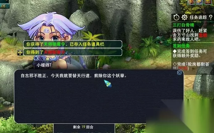 16,误伤了白衣人,去方寸山找觉明求药救人。(直接给予任务道具:天师降魔令)