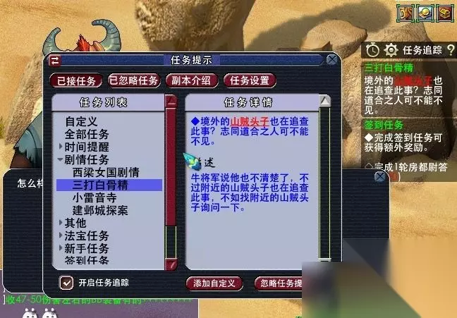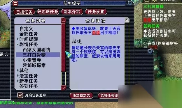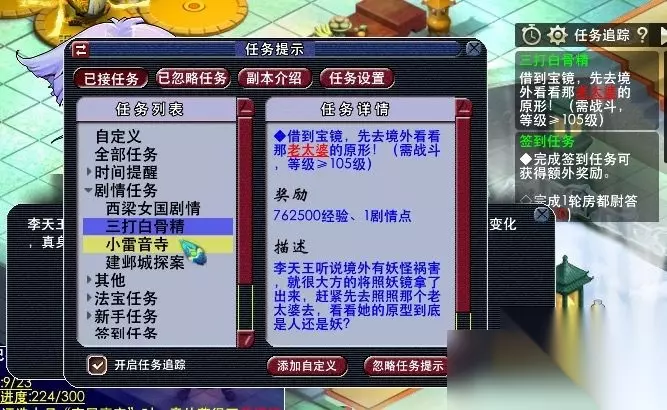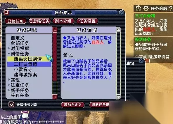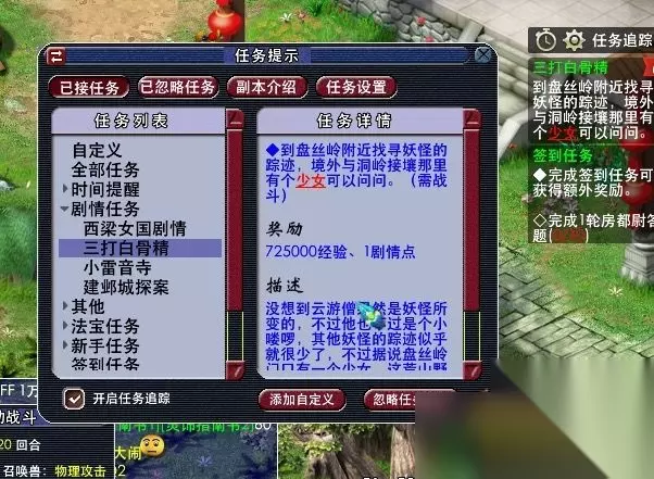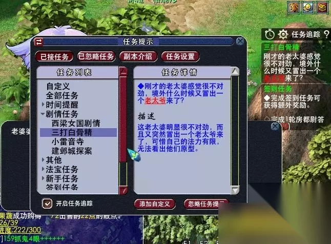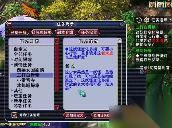 25,获得任务道具:照妖镜。去看看老太婆的原型。(此处需人物等级≥105,战斗,胜利762500经验,一点剧情点,难度偏高,主怪df,所有怪会反击物理攻击超高,主怪气血7w左右,小怪气血约5000左右。)