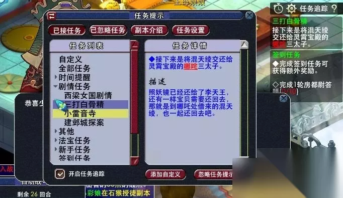 28,帮太上老君找到白露为霜和定神香。 29,神仙都是骗人的,还是找三太子看看吧。 30,三太子真够爽快,获得任务道具:混天绫。 31,带上三太子给的宝贝,去收复妖怪,先去看看老太爷。(需战斗,胜利762500经验,一点剧情点,难度超高,建议组5人队,主怪df,所有怪会反击物理攻击超高。主怪气血约8w左右,小怪气血5000左右。)
