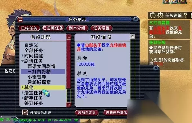 12,找到九转回魂丹救治山贼头子的兄弟。(直接给予九转回魂丹,获得100000两银子。)