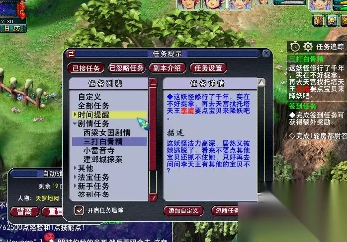 15,快去询问白衣人。(损失人气50点,需人气大于550,战斗,胜利675000经验,获得任务道具:天师降魔令。难度一般,主怪fc,所有怪带反击物理攻击偏高,主怪气血4万左右,小怪气血4500左右。)