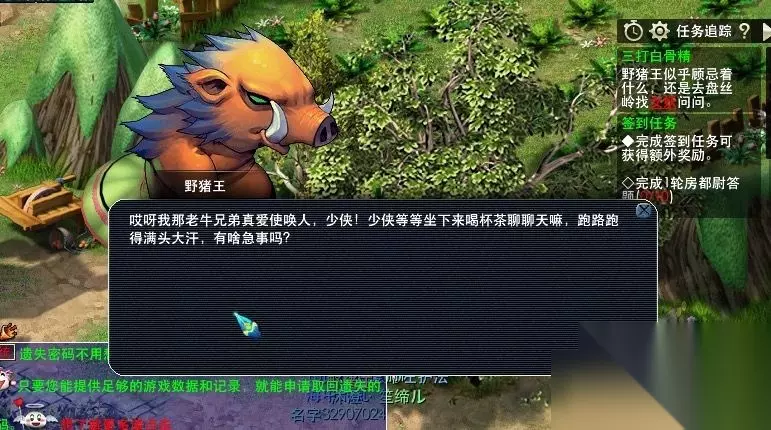 7,原来是一场误会,继续找牛将军问问。(获得任务道具,银腰带。) 8,把银腰带送给野猪王。(失去任务道具,银腰带。) 9,去盘丝岭找女妖了解情况。