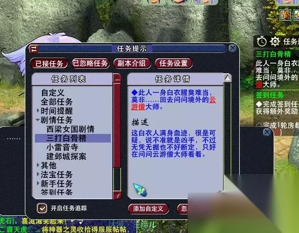 在梦幻西游里面有着很多剧情,三打白骨精就是其中一个,相信很多玩家都想知道三打白骨精剧情吧,下面小编就为大家讲解梦幻西游三打白骨精剧情全攻略,感兴趣的小伙伴不妨来看看吧。 三打白骨精剧情攻略 剧情简介:大唐境外的高老庄原本是一个宁静祥和的小村子,村民男耕女织,过着自给自足犹如世外桃源的日子,然而最近一段时间发生了一件很奇怪的事情。下面听我细细道来:高老庄的高老先生说,村子最近死了好几个人而且还丢失大量的牲畜,经过初步的断定可能是狮驼岭三大王所为,然而并不是。据说白衣人是新面孔而且满身血迹,比较可疑,不曾想却中了云游僧的诡计,险些害的白衣人丢了性命,原来云游僧是白骨精的一个先锋,背后的一切指使都是白骨精所为。狡诈的白骨精变换了一家三口人来欺骗你的眼睛,后在托塔天王李靖以及哪吒三太子的帮助下,消灭白骨精。 剧情领取条件:人物等级需≥100级且完成100级之前的剧情,老太婆,老太爷需人物等级≥105级。NPC:云游僧(大唐境外350,30) 剧情奖励:共计经验:4775000,共计金钱110万两银子,随即2-3宝石,共计剧情点:三点,人气:50(100白衣人处需扣除50点)。 准备物品:九转回魂丹,红血散,定神香以及白露为霜。(以上药品不限品质) 剧情简单流程:云游僧-高老先生-云游僧-水云仙-牛将军-狮驼岭三大王(战斗,战斗胜利获得65万经验)-牛将军(得到银腰带)-野猪王(给予银腰带)-女妖-牛将军-山贼头子(对话)-山贼头子(给予九转回魂但,获得10万两银子)-白衣人-云游僧-白衣人(战斗,人气需大于550,战斗胜利587500经验,扣除50点人气,获得天师驱魔令)-觉明(给予天师驱魔符)-觉明(给予红血散,得到无常丹)-白衣人(给予无常丹)-云游僧(战斗,胜利687500经验)-少女(战斗,胜利725000经验,一点剧情点)-老太婆-老太爷-觉明-李靖(获得照妖镜)-老太婆(等级需≥105,战斗,胜利762500经验,一点剧情点)-李靖-太上老君(准备物品:白露为霜,定神香)-哪吒(获得物品:混天绫)-老太爷(战斗,胜利762500经验,一点剧情点)-李靖(失去照妖镜)-哪吒(失去混天绫)-高老先生(完成剧情:奖励100万两银子,50万经验,100点人气,2-3级宝石随机一颗。) 1,找大唐境外(350,30)云游僧触发剧情。