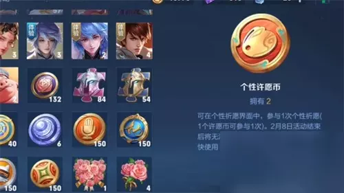 王者荣耀最近的新年活动当中上线了一个全新的道具-个性许愿币,很多的玩家不知道这个道具到底是有什么用,对此小编今天就给大家带来一期详细的解答,感兴趣的玩家快来看看吧。 王者荣耀个性许愿币如何使用 1、个性许愿币是一个抽奖道具,玩家可以使用它来参加对应的活动个性祈愿,就比如最近新年版本的兔年个性许愿币就是玩家抽取专属卡池的道具。