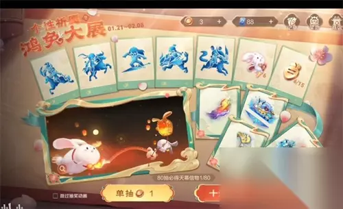 2、兔年个性许愿币:参加祈愿可以获得兔年限定的个性资源奖励,奖励为鸿兔大展天幕,山海有灵击败特效,回城特效,还有拖尾特效,灵兽集结荣耀播报。