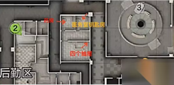 4、第四个地方是医务室,医务室内有一个保险箱,也需要钥匙才能进入,医务室旁边的有一个不需要钥匙的房间,里面有衣服以及药品。