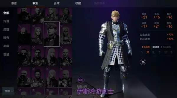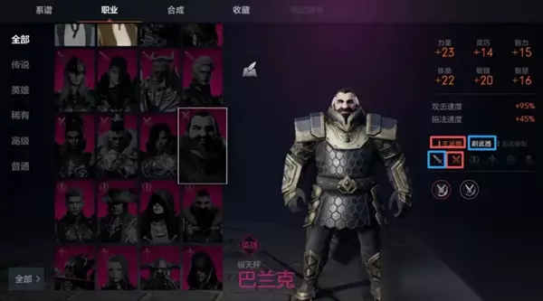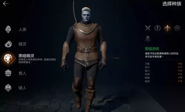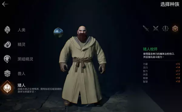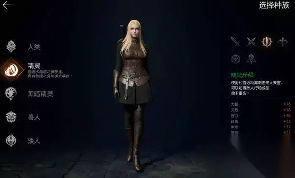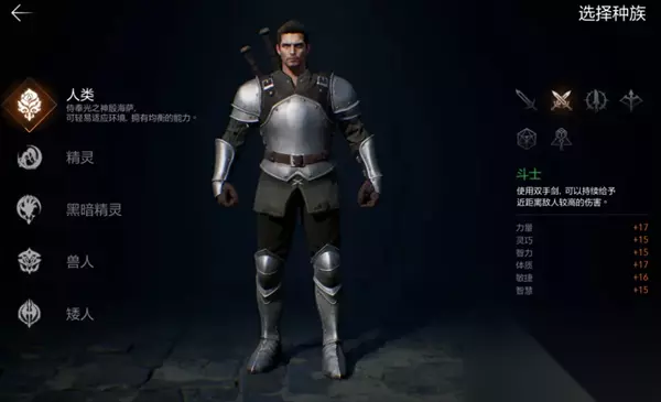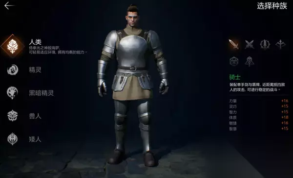 而同一种职业被不同种族选择后,这些职业的基础属性也会有所不同: 比如人类选择单手剑时,整体攻守能力以及数值更均衡,精灵选单手剑时则防御更高,兽人单手剑则力量和体力值更高; 再比如,精灵和暗精灵敏捷数值更高,选择匕首职业后输出打暴击能力更强。 需要注意的是,游戏中角色能使用的技能与种族无关,只与角色当前职业以及佩戴的武器有关哦。 二、 职业解读&选择推荐 游戏中目前有骑士、斗士、突袭者、弓手、牧师以及巫师这六种职业,每个人前期可以选择一种主职业使用,主职业可以随着等级以及主线任务的推进转职成同系更强大的职业