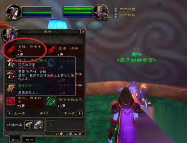 相对应的肉也是很好获得的,不管是去A这里成堆的秃鹫,还是做相关的任务,都可以获得不少。 4,经过前两张图纸的练习,烹饪技能怎么也得到320或者325了吧!若真能到325极好,可以直接去【纳格兰】学习325的“塔布肉排”以及“烧烤裂蹄牛”图纸。 5,如果还差点到325,那么就去【赞加沼泽】西边的孢子村,购买310可学的“孢子小吃”烹饪图纸,是需要2个亮顶蘑菇兑换(而亮顶蘑菇是路边随手搜集的)。此图纸需要“奇怪的孢子”,是击杀孢子类怪物获得;