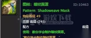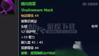 暗纹面罩配方 暗纹面罩拥有增加10点智力以及24点暗影法术伤害的特性。 这款布甲44级就能带,术士如果在练级的是会搞一套暗纹在身上那可真是绝配。 属性比满级之后的恶魔布帽稍逊,但是这个便宜而且很早就能带。 暗纹面罩图纸掉落地点