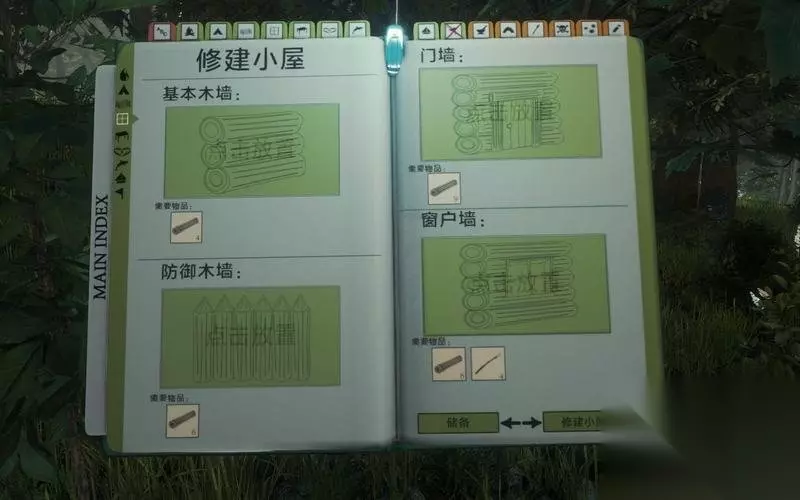 4、修建小屋 这是一个可以自主设计的宿营地。 玩家可以根据自己的喜好和需要建造营地房屋。 对房屋门、墙、窗户和栅栏都可以进行自由的规划和建造。
