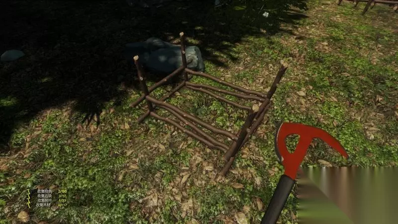 刚放置的营地只是一个建筑规划。 需要玩家搜集到相应的原料才能建造。 例如狩猎营地,需要9根树枝、5块石头和8根木材。
