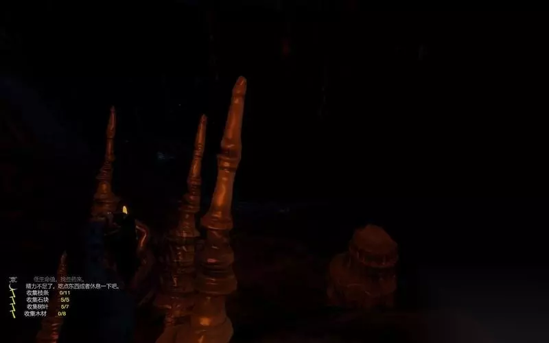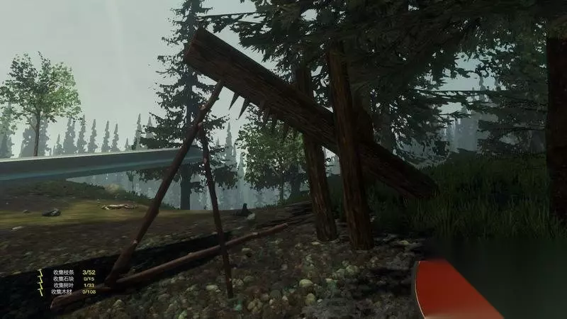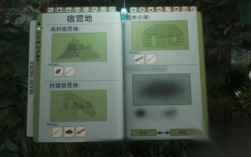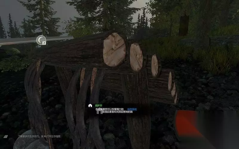 一开始可以选择消耗较少的棚屋营地。 只需要少量树枝和树叶就能快速的完成。 这样就能利用营地进行休息和存档了。
