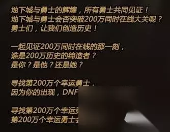 DNF在公测之后可以说是创造了中国网游历史的奇迹,据官方公布的数据,2009年3月DNF的在线玩家就突破了150万,所以在6月的周年庆中,官方给出的就是活动就是寻找第200万位登录游戏的勇士。