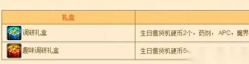 选择符合大多数玩家喜好的玩家将会获得“趣味调研礼盒”,选择符合少数玩家喜好的玩家将会获得“调研礼盒”。礼盒中可开出的奖励为生日售货机硬币及各种药水等等。