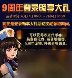 九周年已经离我们不远了,不出意外会在6月22日更新后上线活动,根据西海岸EX的文件来看,将会包含欢乐代币券、装备强化券、装备增幅券、9周年宠物、升级券等奖励,具体的也只能等到正式服更新之后才能知晓,我们一起期待吧!