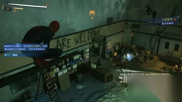 在公园进入战斗,不能使用蛛丝,就是单纯的闪避、击飞、格挡,好好熟悉一下基础战斗吧!
