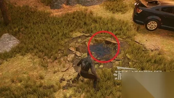 跟着路线走,在一辆车前调查地上的水池。