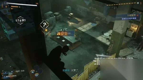 下一个区域屋顶是绝对安全的,想办法暗杀落单的敌人,如果没人落单就攻击可互动的物品,就会有人落单。