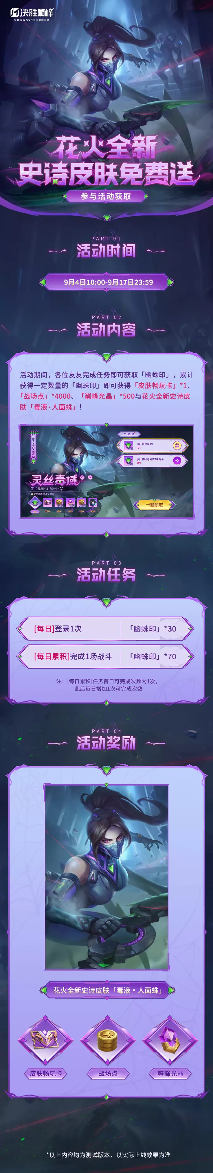 9月4日-9月17日,参与活动即可免费获取花火全新史诗皮肤「毒液·人面蛛」,活动详情请戳下方长图查看↓