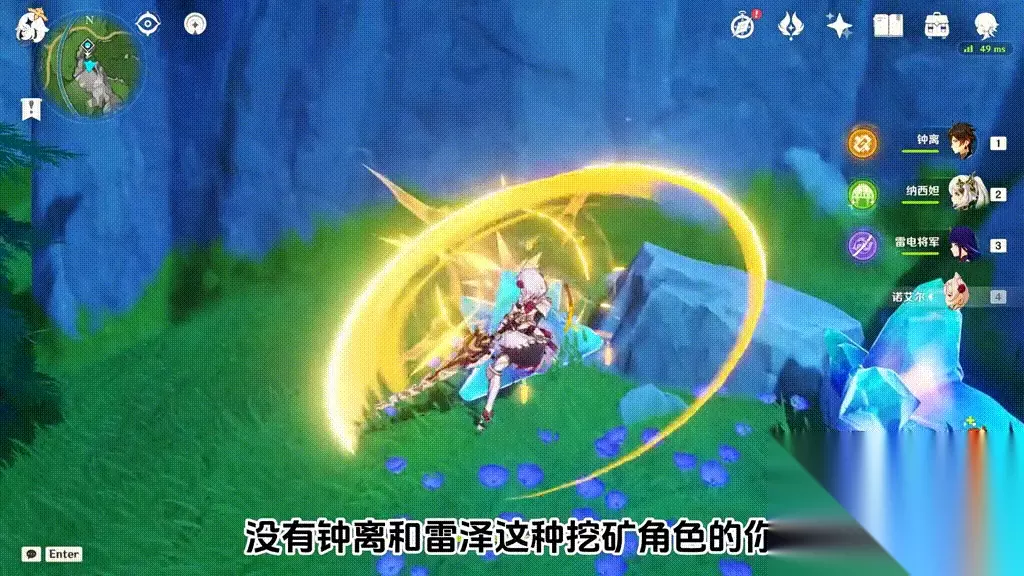 原神中超实用的小技巧。 原神实用小技巧。 ·第一个,冰岩挖矿小技巧。没有钟离和雷泽这种挖矿角色的你还在用大剑一刀一刀砍吗?拿凝光做演示,这是凝光正常的挖矿速度,要四下普攻才能挖完。但是只要先用冰系攻击打一下矿石,凝光一下普攻就能挖矿啦,要比用大剑砍快很多。这种挖矿只有冰和岩可以,其他属性和岩系是不行的。 ·第二个,大招的快捷释放。移动端都知道直接点击大招图标就可以放大招,但是在电脑端要怎么操作?其实在电脑端只要按Alt+角色位置数字就可以了,这里Alt+2就是菲谢尔大招,Alt+3就是阿贝多大招,熟练运用后还是比较省事的。