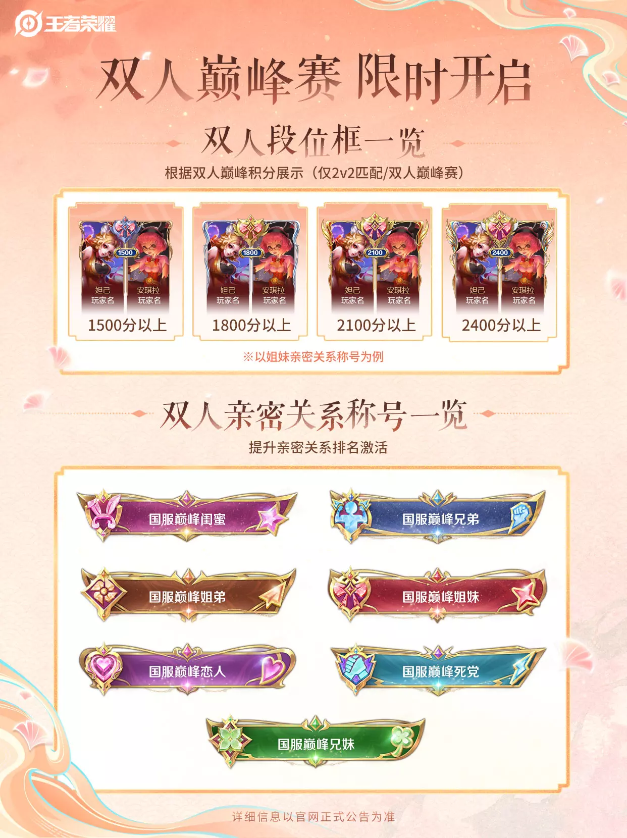 - 8.29~9.24 双人巅峰赛限时开战,和亲密关系好友组队,共同角逐国服亲密关系排名!