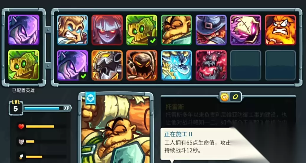 4、托雷斯 托雷斯负责防御工事的建设,他比较偏向于拦截,他的“正在施工”会召唤出2个工人,工人会持续在场上呆12秒,有65点生命值,每次攻击会造成4到8点的物伤,他的“午休时间”会立刻停下战斗,享受小吃为自己恢复120生命,他的“拆迁达人”会快速旋转手中的木梁,对周围敌人造成40到60的物伤,他的“防御塔楼”会临时建造出一座塔楼来攻击经过的敌人,持续12秒时间,他的大招会朝着路径丢出一个巨大钢球,造成240点物伤并眩晕敌人2秒。