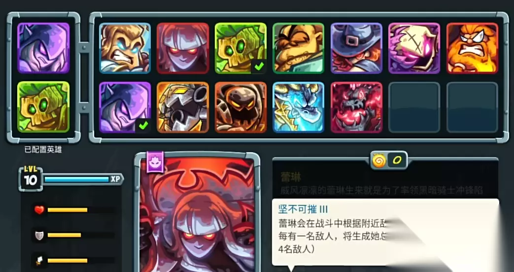 2、蕾琳 蕾琳的定位是肉盾,拦截和生存能力都比较强,她的“坚不可摧”会在战斗中根据附近敌人的数量来生成生命护盾,每有一名敌人就会生成30%生命的护盾,上限会4名,她的“闻风丧胆”会让附近的敌人眩晕2秒,并降低其80%攻击伤害持续6秒,她的“残酷斩击”会利用剑攻击敌人,造成480点真实伤害,她的“全力猛攻”会在10秒内让自身的攻击速度加快,并对攻击目标周围的敌人也造成100%伤害,她的大招是召唤出一位黑暗骑士,骑士拥有360点生命值,每一次攻击都会形成真伤。