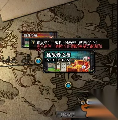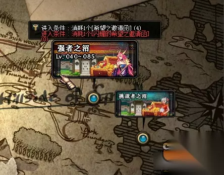 抉择之沼这次活动,推出了两个地图,可供玩家选择: 1。挑战者之沼。 进入要求:Lv1~Lv85。门票[希望之邀请函]一张。 2。强者之沼。 进入要求:Lv40~Lv85。门票[希望之邀请函]一张。