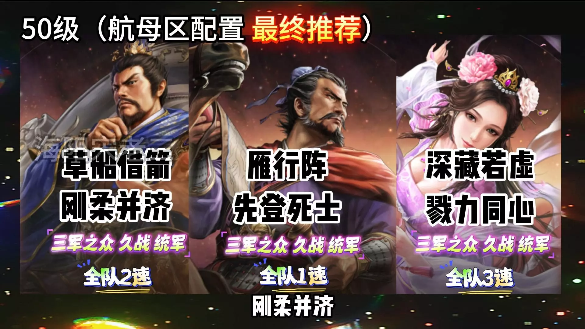 五套T0阵容搭配 1、孙权、太史慈、周泰(吴骑阵容) 孙权:战法配置为当锋摧决、兵无常势,提供控制与稳定输出。 太史慈:战法配置为折冲御悔、锋矢阵,增强队伍生存能力与输出。 周泰:战法配置为一力据守、抚辑军民,为队伍提供强大的防御支持。 2、姜维、庞统、诸葛亮(蜀智阵容) 姜维:战法配置为夺魂挟魄、杯蛇鬼车,增强自身属性并造成群体伤害。 庞统:战法配置为太平道法、无当飞军,提供高额法术伤害与辅助效果。 诸葛亮:战法配置为八门金锁阵、婴城自守,控制敌人并增强队伍生存能力。 3、周泰、凌统、孙尚香(吴骑变种) 周泰:战法配置为西凉铁骑、盛气凌敌,提升队伍速度与防御。 凌统:战法配置为破军威胜、横扫千军,提供高额物理伤害与控制。 孙尚香:战法配置为裸衣血战、虎踞鹰扬,增强自身输出并降低所受控制。 4、吕布、郭嘉、周泰(三势吕阵容) 吕布:战法配置为一骑当千、鬼神霆威,作为队伍核心输出。 郭嘉:战法配置为三势阵、当锋摧决,提供控制与增益效果。 周泰:战法配置为虎豹骑、铁骑驱驰,提升队伍速度与吕布输出。 5、关羽、关银屏、魏延(蜀枪阵容) 关羽:战法配置为箕形阵、威谋靡亢,提供控制与减伤效果。 关银屏:战法配置为青州兵、据水断桥,增强队伍生存能力与输出。 魏延:战法配置为破阵摧坚、绝其汲道,提供高额物理伤害与减益效果。 最强五套共存队伍 在构建共存队伍时,需要考虑队伍间的互补性与策略性,以下是一个基于上述T0阵容的共存队伍示例: 1、吴骑阵容(孙权、太史慈、周泰):作为快速突击队,适合先手打击敌人。 2、蜀智阵容(姜维、庞统、诸葛亮):提供稳定的法术输出与控制,适合中后场作战。 3、三势吕阵容(吕布、郭嘉、周泰):利用吕布的高额输出与郭嘉的控制,形成强大的单点突破能力。 4、魏盾阵容(如曹操、典韦、许褚):作为防御型队伍,可与其他队伍形成互补,承担吸引火力与保护队友的任务。 5、蜀枪阵容(关羽、关银屏、魏延):以关羽为核心,结合关银屏与魏延的辅助与输出,形成强大的物理打击能力。 共存队伍的构建还需考虑武将的获取难度、战法搭配以及玩家自身的游戏策略与喜好,以上推荐仅供参考,具体搭配还需根据实际情况进行调整。